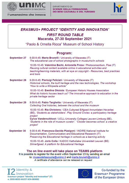 Nei giorni 28-30 settembre 2021 si terrà a Macerata la prima Tavola Rotonda del progetto europeo “I² – Identity and Innovation” cofinanziato dall’Unione Europea sotto il programma “Erasmus Plus – Azione chiave 227: Partnerships for Creativity”.